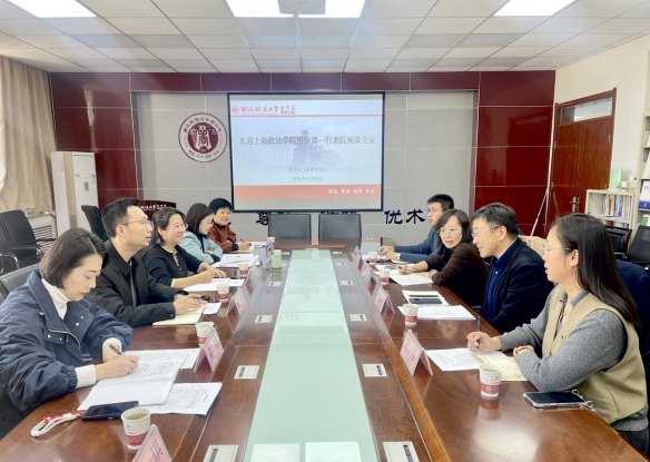 近日,上海政法学院党委常委、组织部统战部部长刘志强一行4人到访探花直播 ,调研党建工作“一融双高”开展情况。学院领导班子成员、部分党支部书记参加调研,院党委书记赵参主持会议。