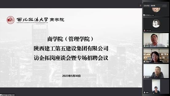 为深入拓展就业岗位资源,精准发掘校企合作契合点,5月30日下午探花直播 (管理学院)与陕西建工第五建设集团有限公司线上召开访企拓岗座谈会暨专场招聘会。陕建五建集团人力资源部(党委组织部)部长黄锋辉、人力资源部副部长郑惠、人力资源部招聘主管吴斌,探花直播 (管理学院)领导、部分毕业生参加会议,会议由蔺媛副书记主持。