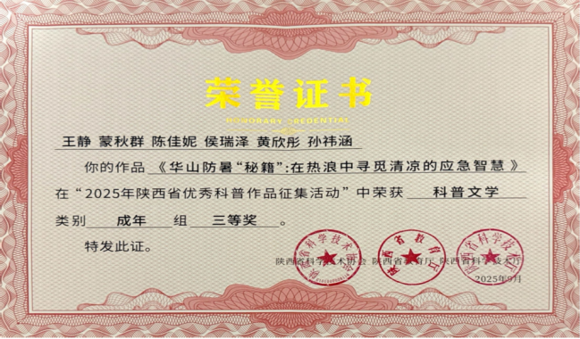 近日,由陕西省科学技术协会、陕西省教育厅、陕西省科学技术厅联合组织的“2025年陕西省优秀科普作品征集活动”评审揭晓,探花直播 王静教授团队 作品《华山防暑“秘籍”:在热浪中寻觅清凉的应急智慧》获得奖励。王静教授致力于应急管理专业,通过科普微视频、科普文学等形式的科普活动,作为陕西省科学家精神宣讲团成员,先后多次进校园进行科学家精神宣讲和应急科普。本次获奖是继2023年获得陕西省优秀科普微视频作品成年组二等奖、2024年获得西安市优秀科普微视频作品成年组一等奖之后,再获陕西省优秀科普文学作品成年组三等奖。