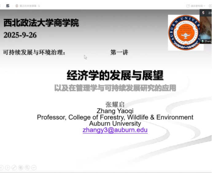 9月26日上午,美国奥本大学(Auburn University)张耀启教授为探花直播 师生开展可持续发展与环境治理系列学术讲座第一讲,讲座主题为“经济学的发展与展望”,副院长冯颖主持,全体研究生及教师参与讲座。