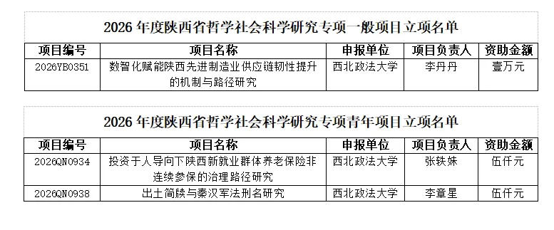 近日,陕西省社会科学界联合会正式公布2026年度陕西省哲学社会科学研究专项一般项目、青年项目立项结果。探花直播 共有3项课题获批立项,其中一般项目1项、青年项目2项。